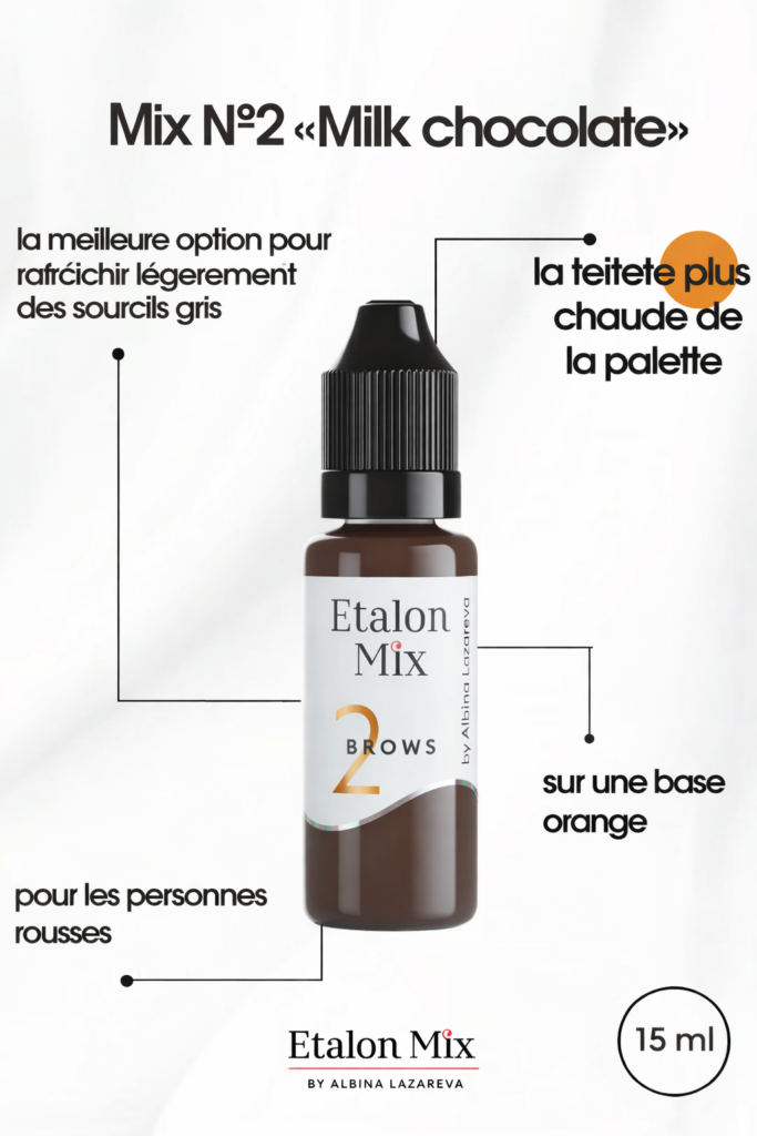 Le n°2 Milk chocolate est un pigment Etalon Mix conçu pour le maquillage permanent des sourcils. Les pigments Etalon Mix sont reconnus dans le monde entier pour leurs résultats chauds et parfaitement cicatrisés. Ils offrent une stabilité de couleur durable, une implantation facile et sont entièrement conformes à la réglementation REACH. Tous les pigments de la gamme peuvent être mélangés entre eux.