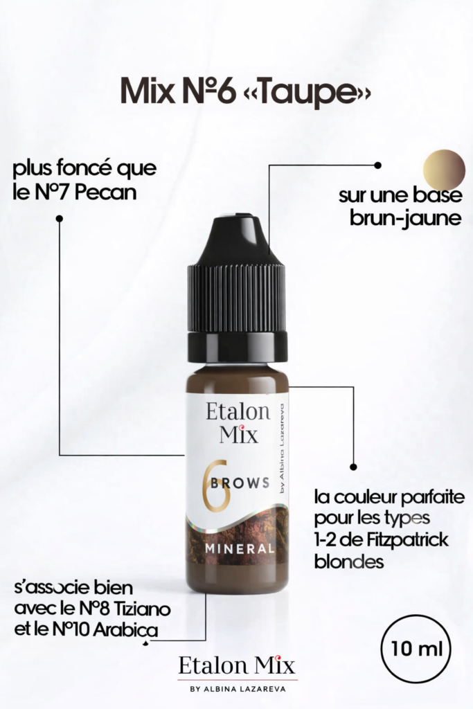 Le N°6 Taupe est un pigment minéral Etalon Mix de 10 ml pour le maquillage permanent des sourcils. Les pigments minéraux Etalon Mix sont stables dans le temps et ne font que s’éclaircir légèrement sans changer de tonalité. Ils sont également plus faciles à implanter que les minéraux traditionnels. La gamme minérale est spécialement stabilisée pour éviter toute décoloration dans la peau, offrant des résultats cicatrisés exceptionnellement beaux qui s’estompent presque entièrement après 1 à 1,5 an. Tous les pigments sont mélangeables entre eux et entièrement conformes à la réglementation REACH.
